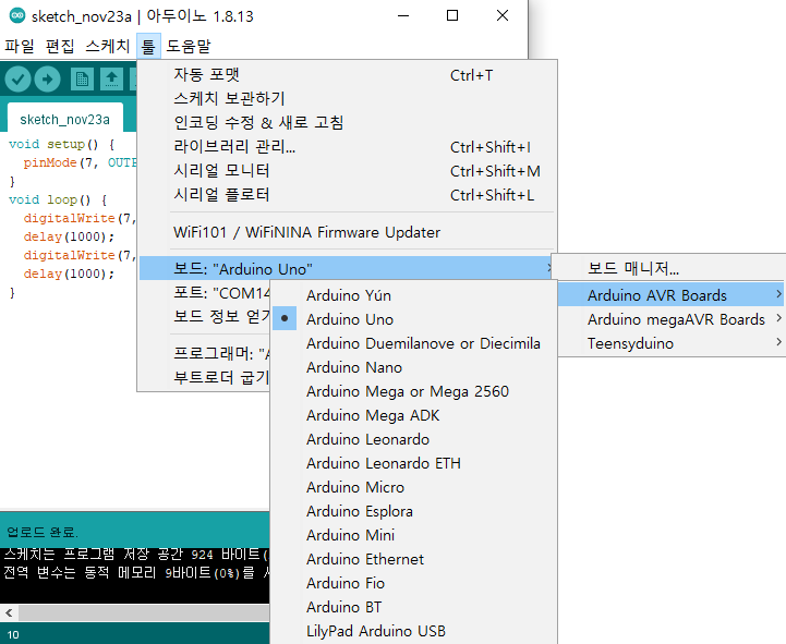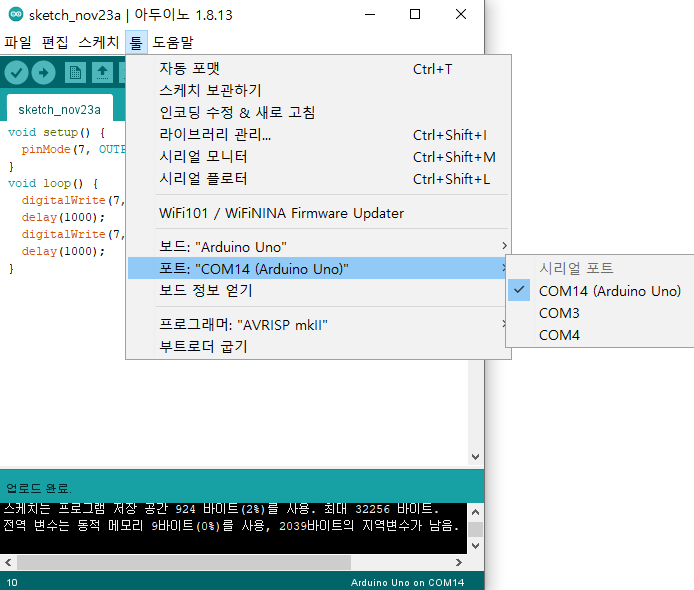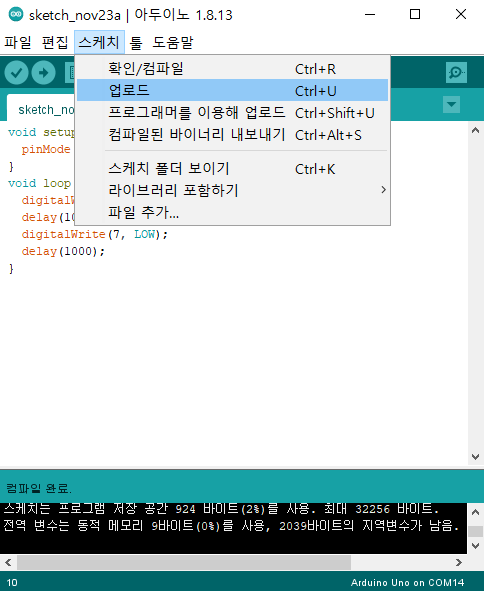 처음에 설치했던 Arduino IDE를 켜서 아래와 같은 코드를 집어 넣는다.